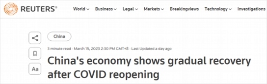 路透社也在15日的報道表示,盡管全球需求及房地產(chǎn)行業(yè)持續(xù)低迷,但2023年前兩個月中國經(jīng)濟活動在消費和基礎(chǔ)設(shè)施投資的推動下穩(wěn)步回升,從疫情的影響中恢復(fù)。