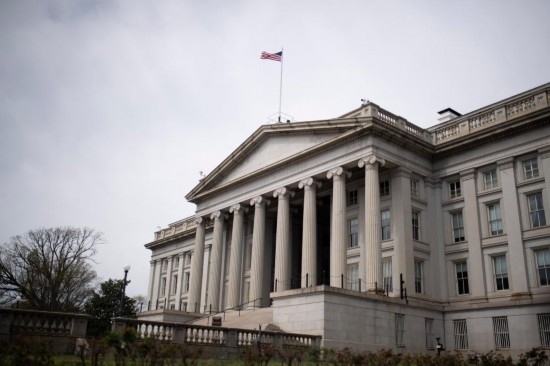 這是2020年3月27日在美國首都華盛頓拍攝的美國財政部大樓。(新華社記者劉杰攝)