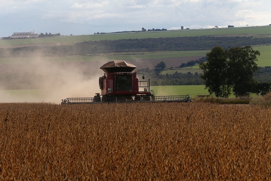 4月12日,在巴西戈亞斯州班德里尼亞農(nóng)場,農(nóng)機進行收獲大豆作業(yè)。新華社發(fā)(盧西奧·塔沃拉攝)