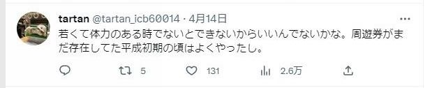 “只有年輕體力好的時(shí)候才能(這樣旅游),挺好的。在還有周游券的平成年代初期,我也這么干過(guò)。”
