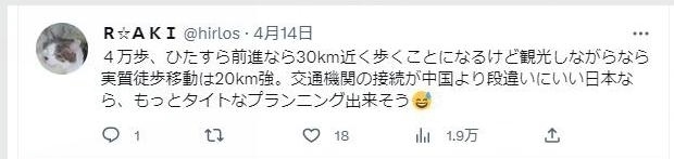 “4萬(wàn)步,直線距離相當(dāng)于將近30公里,不過(guò)如果是徒步邊走邊逛景點(diǎn),差不多是20來(lái)公里。如果在公共交通更便利的日本,應(yīng)該能壓縮出一個(gè)更緊湊的行程。”