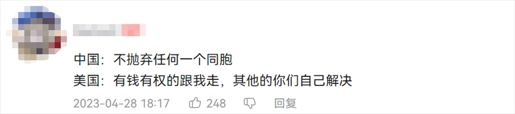 這段視頻引起很多網(wǎng)友的討論,其中有網(wǎng)友簡單總結(jié)了中美撤僑行動的不同?!?/p>