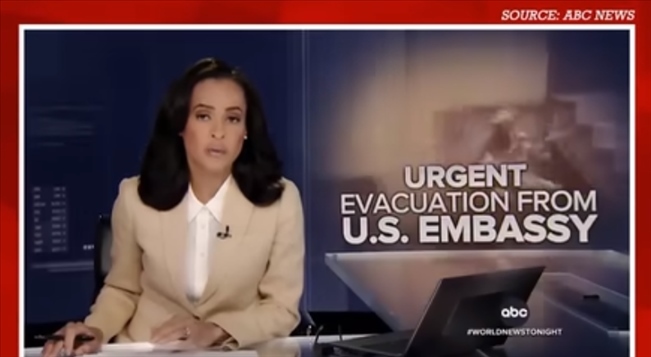 (安柏然所發(fā)視頻中,一名美媒主持人報道美國在夜間出動直升機撤離美國外交官的畫面。)
