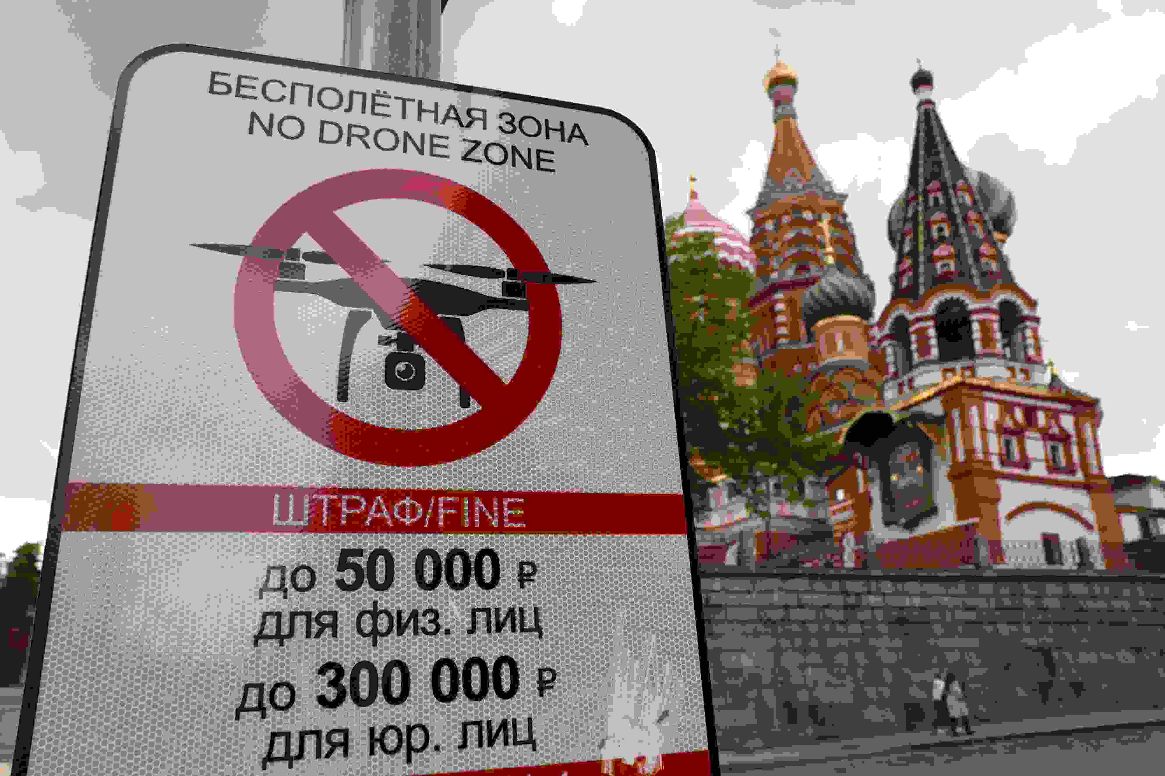 當(dāng)?shù)貢r(shí)間2023年5月3日,俄羅斯莫斯科,莫斯科市中心懸掛的“無人駕駛飛機(jī)禁飛區(qū)”的標(biāo)志,禁止無人機(jī)在該地區(qū)飛行??死锬妨謱m遭無人機(jī)襲擊后,莫斯科市長宣布禁止未經(jīng)授權(quán)的無人機(jī)在俄羅斯首都上空飛行。 視覺中國