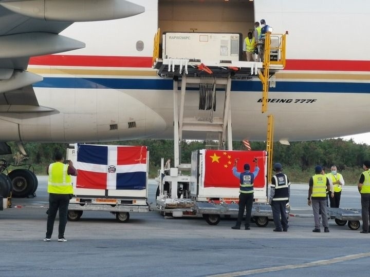 2021年3月17日,運(yùn)載中國新冠疫苗等物資的飛機(jī)抵達(dá)多米尼加首都圣多明各。新華社發(fā)(中國駐多米尼加大使館供圖)