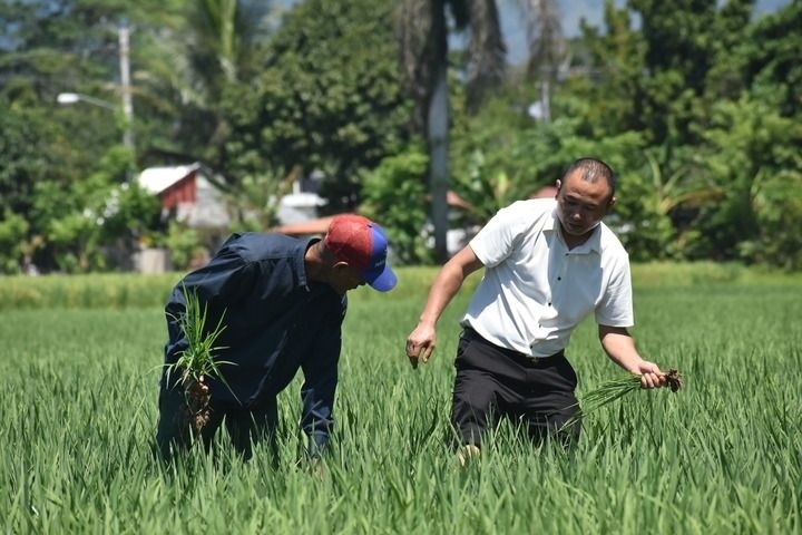 4月26日,在多米尼加首都圣多明各西北約80公里處,中國農(nóng)業(yè)專家(右)和當(dāng)?shù)剞r(nóng)民在多米尼加國家水稻培訓(xùn)中心的一片試驗(yàn)田內(nèi)工作。新華社記者 朱婉君 攝
