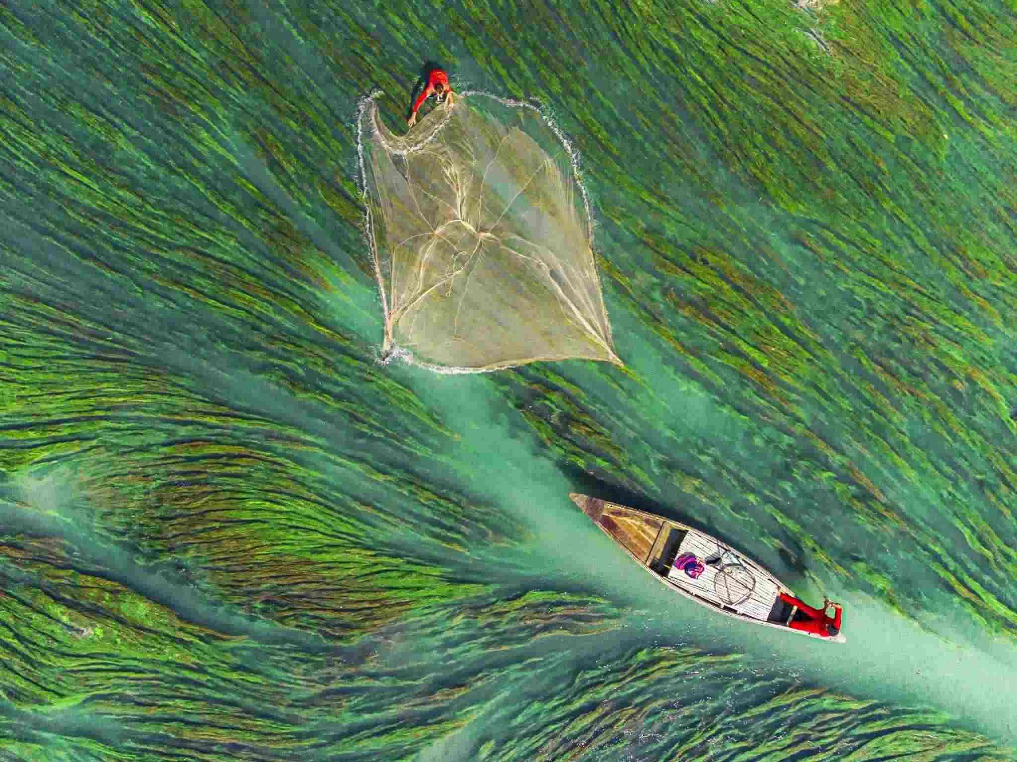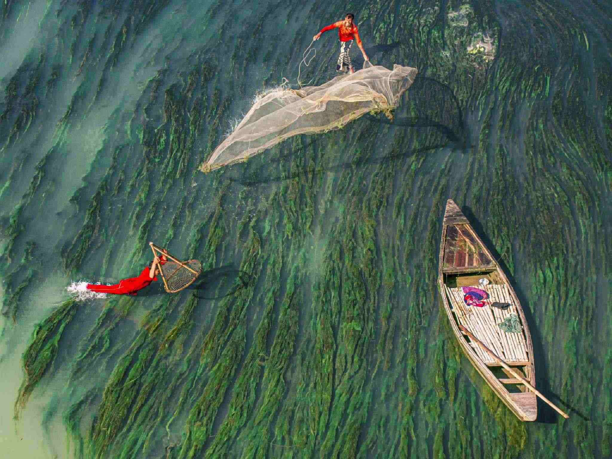 孟加拉拉杰沙希,漁民在河中撒網捕魚,周圍被多彩的水藻包圍。視覺中國