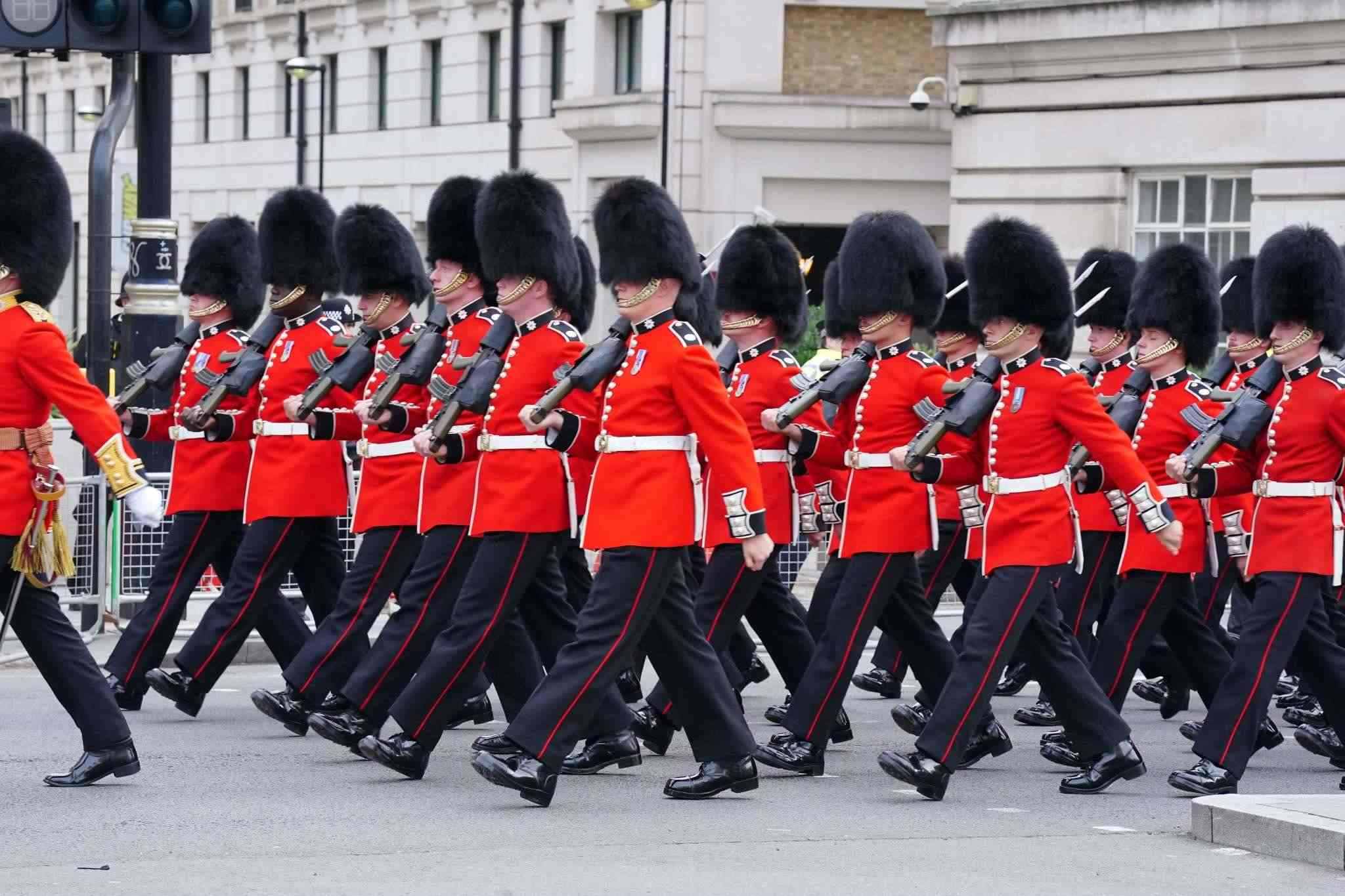 當地時間2023年5月6日,英國倫敦,皇家武裝部隊成員抵達倫敦,參加查爾斯三世加冕典禮。視覺中國