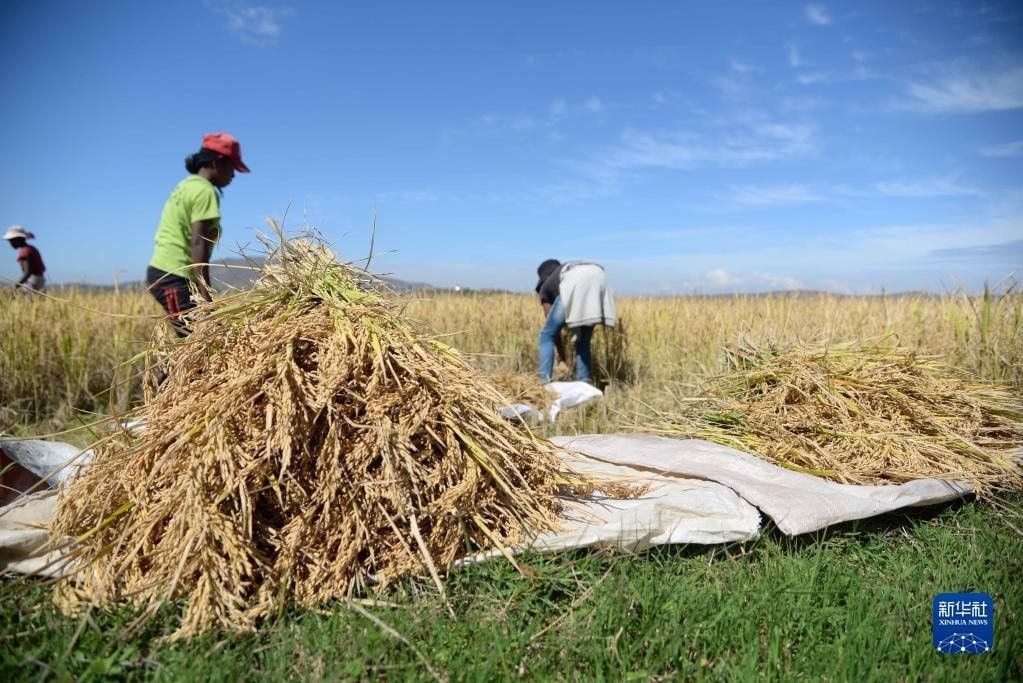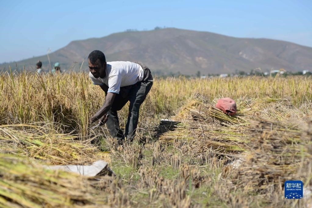 5月12日,在馬達(dá)加斯加首都塔那那利佛附近馬希奇鎮(zhèn)的中國國家雜交水稻工程技術(shù)研究中心非洲分中心,當(dāng)?shù)剞r(nóng)民在雜交水稻高產(chǎn)示范田內(nèi)收割水稻。