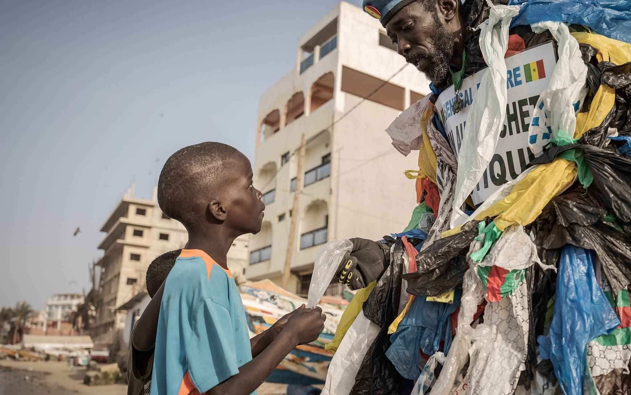 當(dāng)?shù)貢r間2023年4月5日,塞內(nèi)加爾達(dá)喀爾,49歲的塞內(nèi)加爾環(huán)保活動家莫杜·法爾,被稱為“塑料人”,和一個孩子在海灘上散步時拿著一個塑料包裝,提醒人們注意使用一次性塑料的污染。