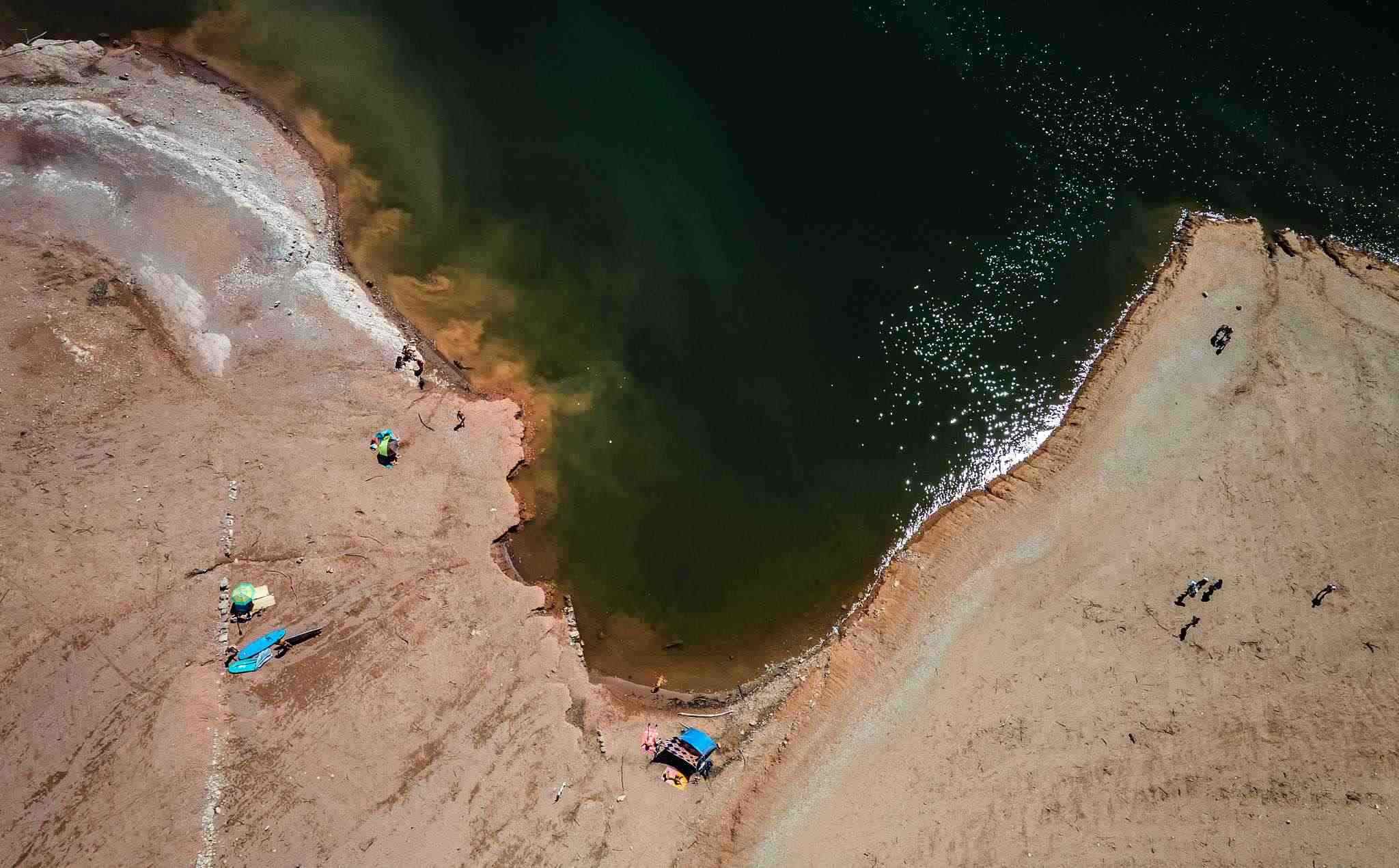 當(dāng)?shù)貢r(shí)間2023年4月16日,美國(guó)內(nèi)華達(dá)州,棕色的科羅拉多河流經(jīng)水位下降的米德湖。