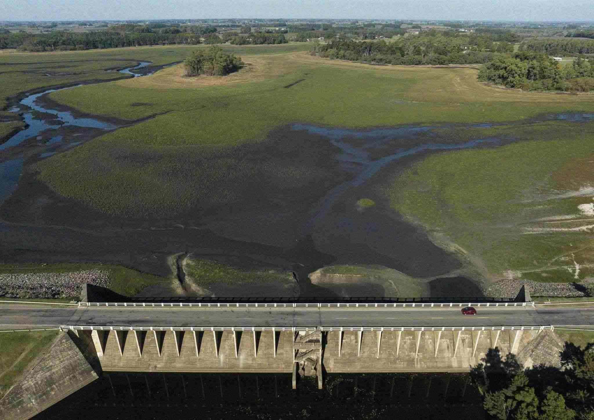 當(dāng)?shù)貢r(shí)間2023年5月15日,烏拉圭卡內(nèi)洛內(nèi)斯,Canelon Grande水庫(kù)。烏拉圭持續(xù)的干旱導(dǎo)致蒙得維的亞和大都市區(qū)的飲用水嚴(yán)重鹽堿化,附近水庫(kù)的水位下降。