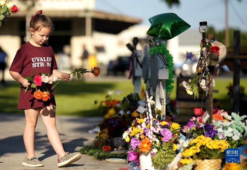 5月24日,在美國得克薩斯州小城尤瓦爾迪的廣場上,一名女孩獻(xiàn)上鮮花悼念校園槍擊遇害者。