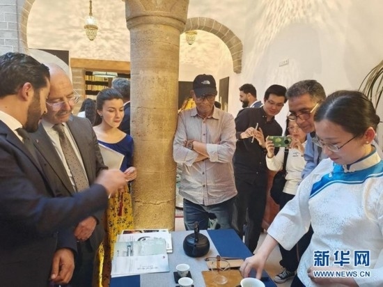 5月22日,在摩洛哥索維拉的“茶和天下·雅集”活動暨中摩茶文化展上,嘉賓體驗中國茶禮表演。(中國文化中心供圖)