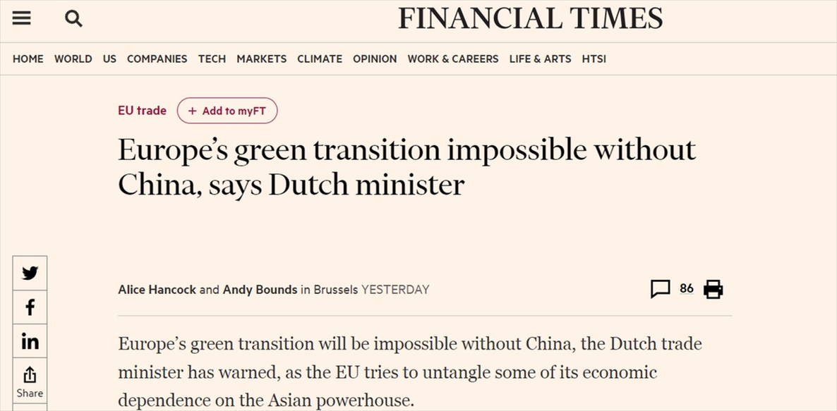 英國(guó)《金融時(shí)報(bào)》28日?qǐng)?bào)道稱,荷蘭外貿(mào)與發(fā)展合作大臣施賴納馬赫爾警告稱,沒有中國(guó),歐洲的綠色轉(zhuǎn)型將無(wú)法實(shí)現(xiàn)。