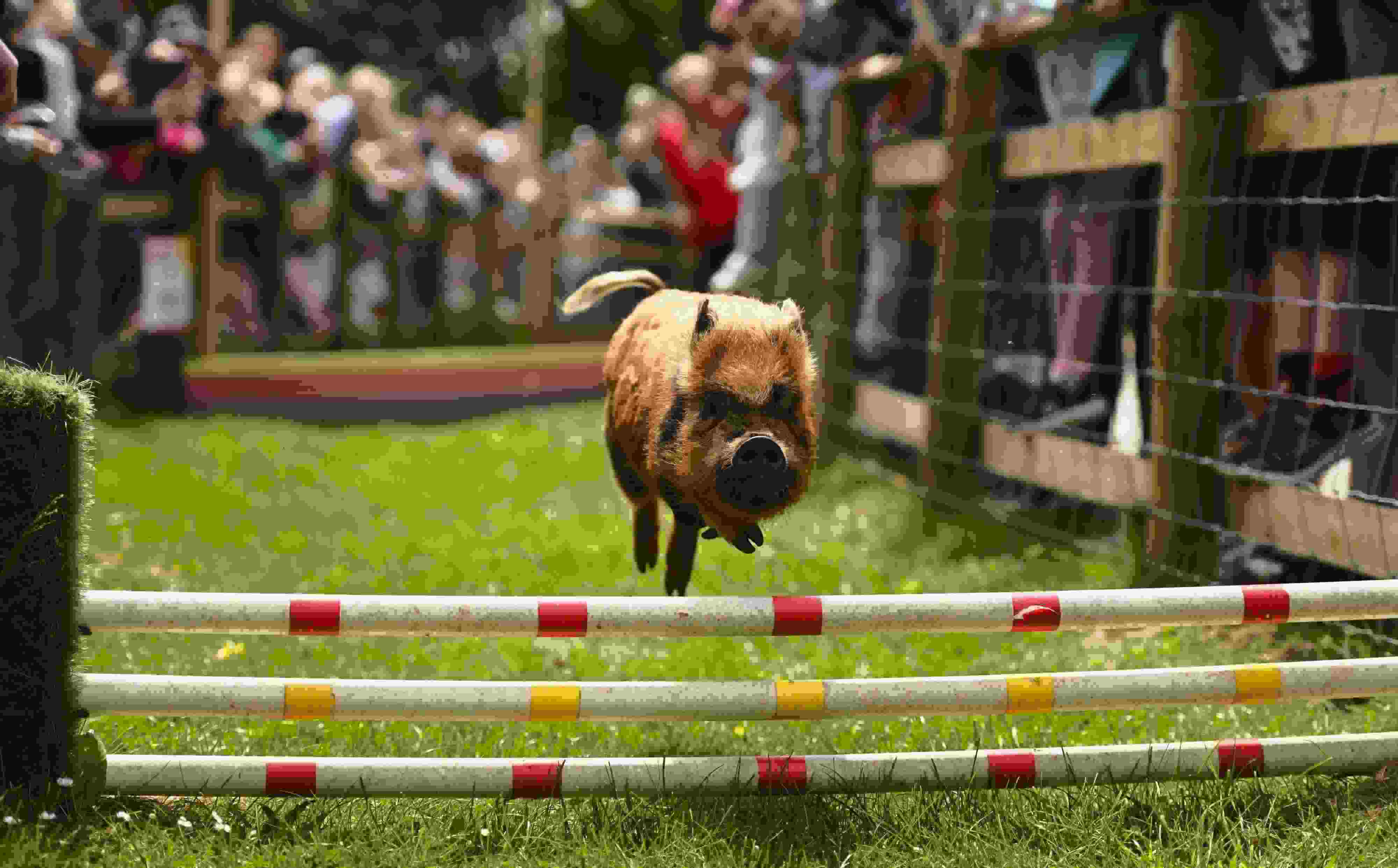 當(dāng)?shù)貢r(shí)間2023年5月31日,英國戴文,當(dāng)?shù)剞r(nóng)場舉行的小豬賽跑活動(dòng),小豬們在賽道上“你追我趕”。 視覺中國