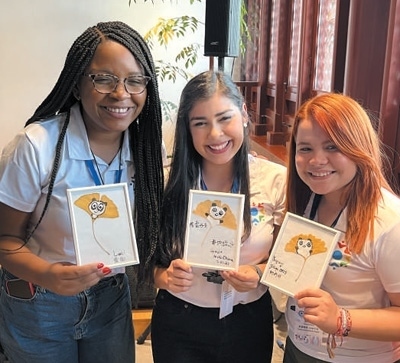 拉美青年代表展示自己學(xué)習(xí)創(chuàng)作的葉畫作品。本報(bào)記者 姜 波攝