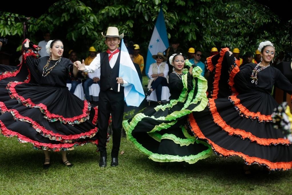 5月30日,舞蹈演員在洪都拉斯圣芭芭拉省圣克魯斯市洛斯納蘭霍斯公園表演民俗節(jié)目。