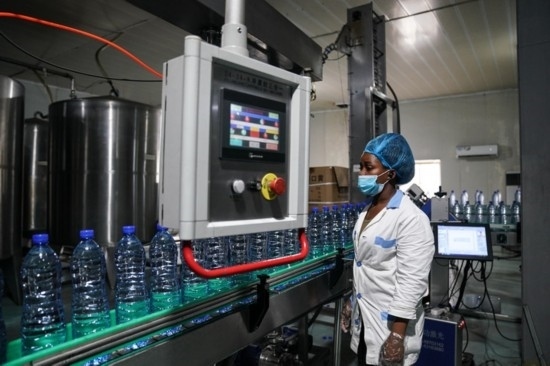 9月9日,當?shù)貑T工在位于加蓬首都利伯維爾的歐來源純凈水廠生產(chǎn)線上工作。新華社記者韓旭攝