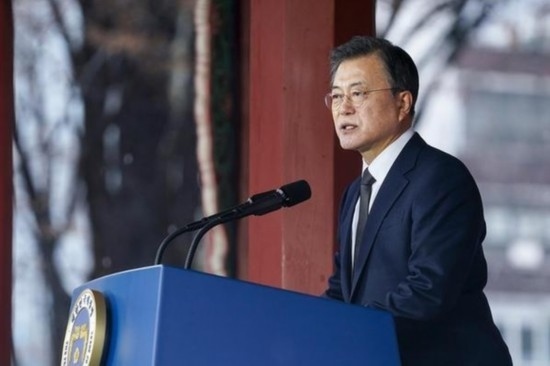2021年3月1日,韓國時(shí)任總統(tǒng)文在寅在首爾塔谷公園發(fā)表講話。新華社發(fā)(青瓦臺(tái)供圖)