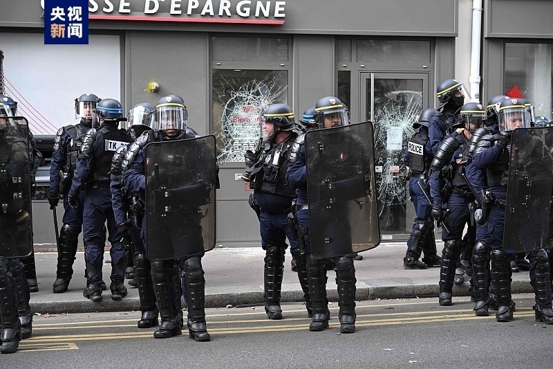 在法國(guó)首都巴黎,游行隊(duì)伍下午3點(diǎn)左右從北站平靜出發(fā)后,隨后一個(gè)由數(shù)百名蒙面男子組成的隊(duì)伍破壞了銀行機(jī)構(gòu)的櫥窗,并向一輛警車(chē)投擲石塊。巴黎警察局稱(chēng),這輛汽車(chē)遭到“鐵棍”的打擊。車(chē)上一名警察手持武器下車(chē),以便與示威者保持距離。一支摩托車(chē)警察部隊(duì)隨后趕來(lái),阻止了破壞行為并保護(hù)了車(chē)上的警察。