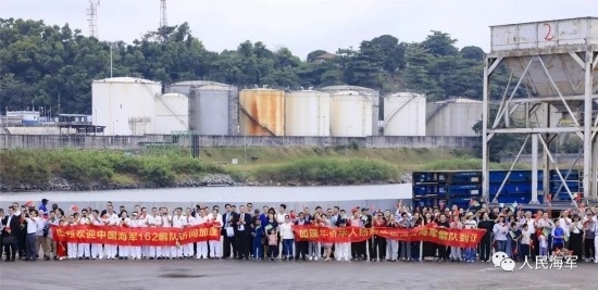 當(dāng)日上午9時(shí),懸掛著中加兩國(guó)國(guó)旗的編隊(duì)艦艇緩緩靠泊奧文多港碼頭,中國(guó)駐加蓬大使李津津及使館工作人員、當(dāng)?shù)刂匈Y機(jī)構(gòu)人員、華人華僑代表,加蓬國(guó)防部秘書長(zhǎng)彭吉中將及官兵代表等300余人位碼頭迎接。