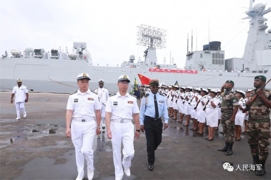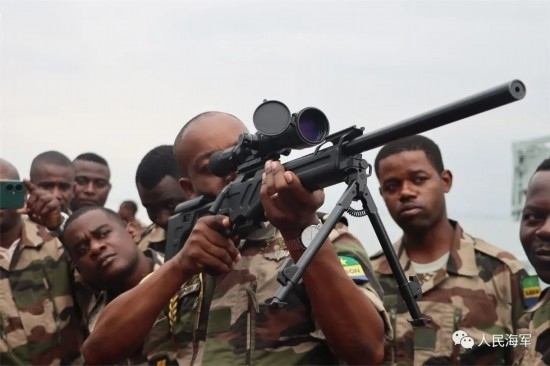 編隊(duì)艦艇靠泊后,編隊(duì)指揮員和李津津大使同加蓬主要領(lǐng)導(dǎo)互致問候,并在加蓬海軍儀仗隊(duì)隊(duì)長(zhǎng)的陪同下檢閱了加蓬海軍儀仗隊(duì)。