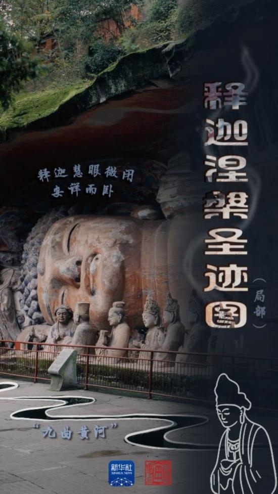 釋迦涅槃圣跡圖龕高7米、寬32米、深5米,刻像37尊。釋迦慧眼微閉,安詳而臥。佛像雙腳隱入巖際,右肩陷于地下,以有限的畫(huà)面表現(xiàn)了無(wú)限的藝術(shù)形象。