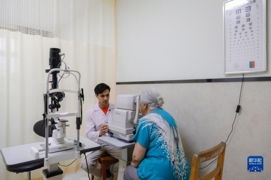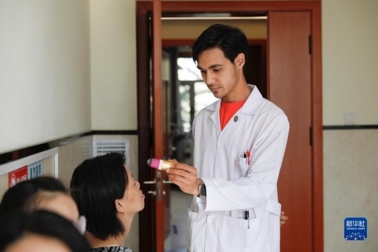 甘肅中醫(yī)藥大學(xué)針灸推拿專(zhuān)業(yè)的土庫(kù)曼斯坦留學(xué)生迪達(dá)(左)在臨床實(shí)習(xí)中為患者檢查眼睛(7月28日攝)。新華社記者 方欣 攝