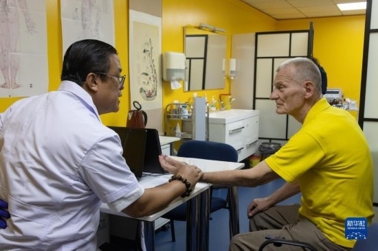7月20日,在匈牙利布達(dá)佩斯匈牙利岐黃中醫(yī)藥中心,中心負(fù)責(zé)人陳震(左)在為患者弗賴(lài)紐·約瑟夫把脈。新華社發(fā)(弗爾季·奧蒂洛攝)
