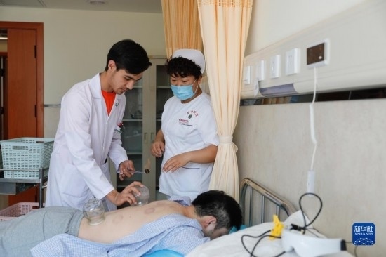 甘肅中醫(yī)藥大學(xué)針灸推拿專(zhuān)業(yè)的土庫(kù)曼斯坦留學(xué)生迪達(dá)(左)在甘肅中醫(yī)藥大學(xué)附屬醫(yī)院護(hù)士的指導(dǎo)下為患者進(jìn)行拔罐治療(7月28日攝)。新華社記者 方欣 攝