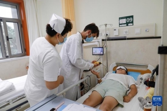 甘肅中醫(yī)藥大學(xué)針灸推拿專(zhuān)業(yè)的塔吉克斯坦留學(xué)生紀(jì)明哲(中)在臨床實(shí)習(xí)中為患者進(jìn)行直流電離子導(dǎo)入操作(7月27日攝)。新華社記者 方欣 攝