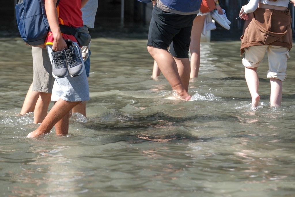 當(dāng)?shù)貢r(shí)間2023年8月6日,意大利威尼斯,城內(nèi)部分地區(qū)積水嚴(yán)重,游客光腳走在水中。