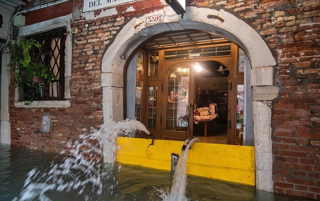 當(dāng)?shù)貢r(shí)間2019年11月17日,意大利威尼斯,當(dāng)?shù)厮汲掷m(xù)。一家餐廳用水泵排水。