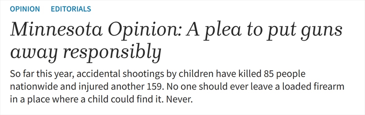 報道指出,這樣的數(shù)據(jù)駭人聽聞,由于成年槍支擁有者的疏忽大意,太多孩子的童年被迫縮短,幸存下來的人的生活也不可挽回地遭到破壞。任何人都不應(yīng)該把上了膛的槍支留在兒童能夠找到的地方,絕對不可以。