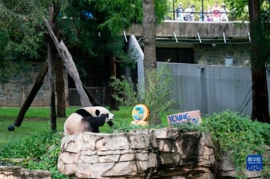 8月21日,游客在美國首都華盛頓史密森學會國家動物園觀看大熊貓幼崽“小奇跡”過生日。新華社記者 劉杰 攝