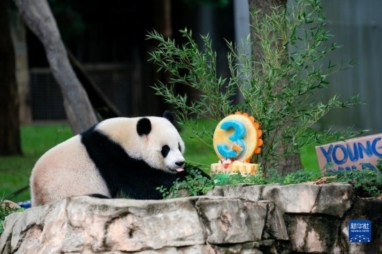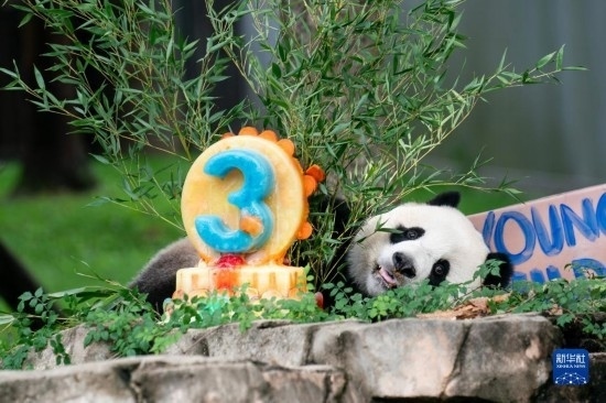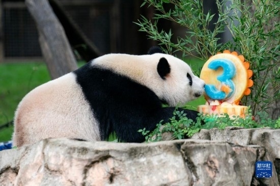8月21日,大熊貓幼崽“小奇跡”在美國首都華盛頓史密森學會國家動物園享用生日蛋糕。新華社記者 劉杰 攝
