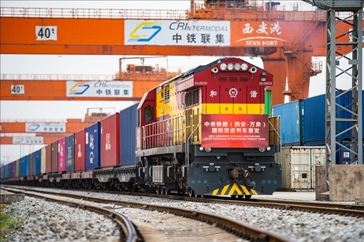 2022年4月22日,陜西西安首趟中老鐵路(西安至萬(wàn)象)國(guó)際貨運(yùn)列車(chē)從西安國(guó)際港站發(fā)車(chē)。新華社記者 劉翔 攝