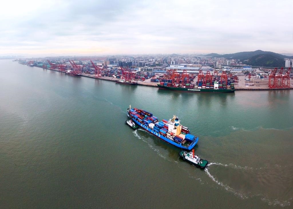 在福建自貿(mào)區(qū)廈門片區(qū)東渡港區(qū),一艘貨輪向碼頭靠攏(2017年8月26日無人機(jī)照片)。(新華社記者姜克紅攝)