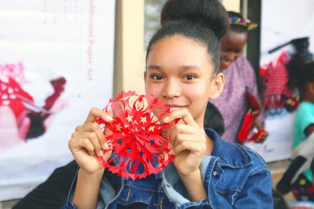 9月23日,盧旺達(dá)首都基加利,在盧旺達(dá)大學(xué)孔子學(xué)院舉辦的“中國文化進(jìn)校園”暨中秋國慶慶祝活動(dòng)現(xiàn)場(chǎng),一名女孩展示剪紙成果。(新華社發(fā),黃萬晴攝)
