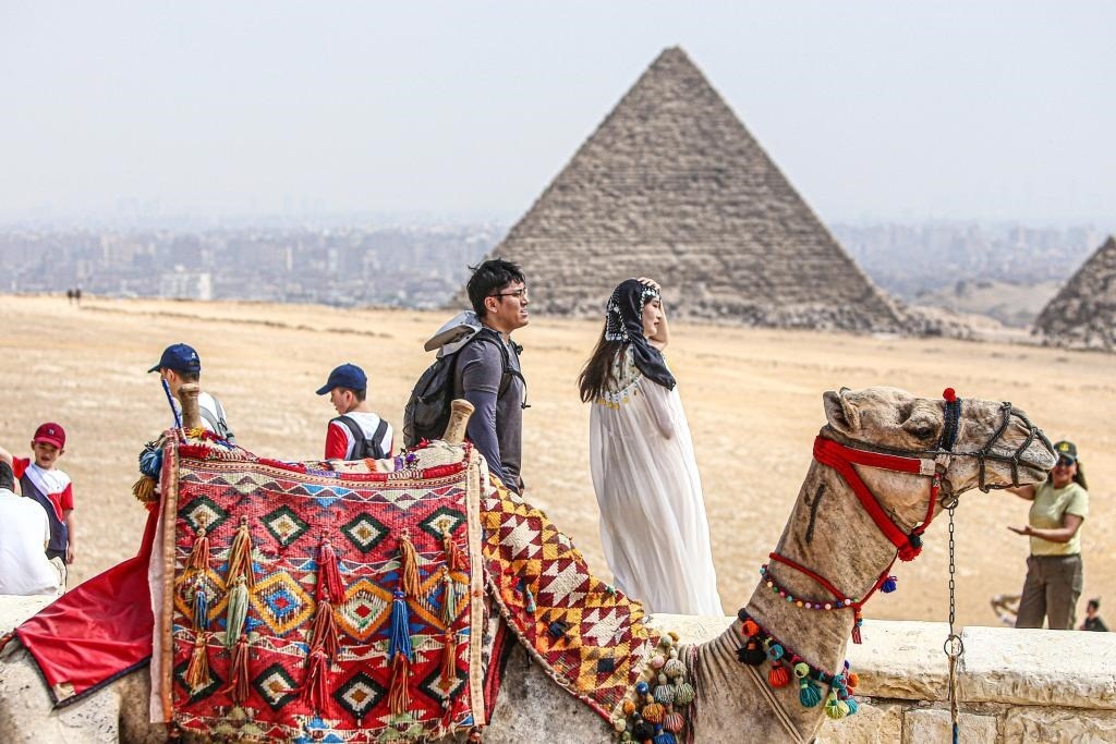 10月4日,中國游客在埃及吉薩金字塔景區(qū)游覽。(新華社發(fā),艾哈邁德·戈馬攝)