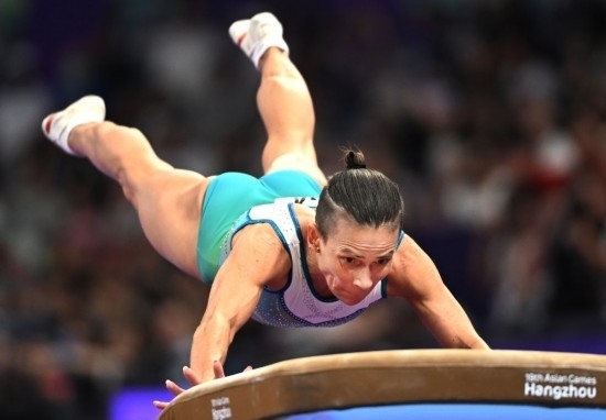 9月28日,烏茲別克斯坦選手奧克薩娜·丘索維金娜在杭州亞運會競技體操項目女子跳馬決賽中,最終她獲得第四名。新華社記者 程敏 攝