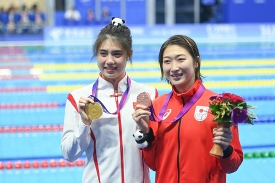 9月29日,冠軍中國選手張雨霏(左)和季軍日本選手池江璃花子在杭州亞運會游泳項目女子50米蝶泳頒獎儀式后。新華社記者 黃宗治 攝