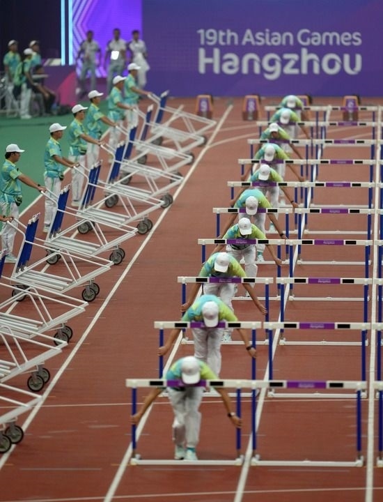 9月30日,杭州亞運會志愿者在田徑項目女子七項全能100米欄比賽前進行場地準備工作。新華社記者 江文耀 攝