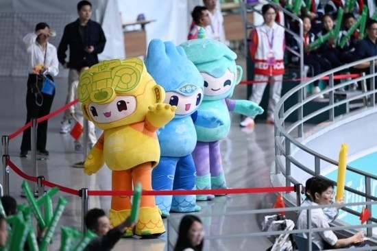 10月7日,杭州亞運會吉祥物在女子花樣輪滑單人滑比賽前的暖場活動中。新華社記者 陳曄華 攝