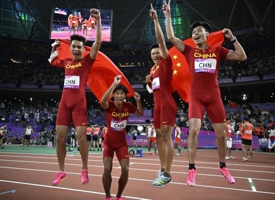 10月3日,中國選手陳冠鋒、謝震業(yè)、陳佳鵬、嚴海濱(從右至左)慶祝奪得杭州亞運會田徑項目男子4x100米接力冠軍。新華社記者 宋彥樺 攝