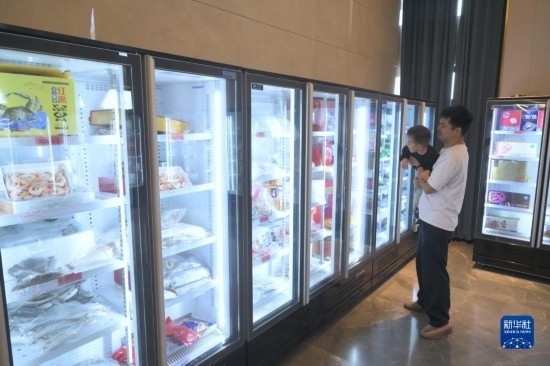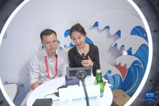 工作人員在第二十三屆中國(guó)國(guó)際投資貿(mào)易洽談會(huì)中印尼“兩國(guó)雙園”展位開(kāi)展直播活動(dòng)(9月9日攝)。