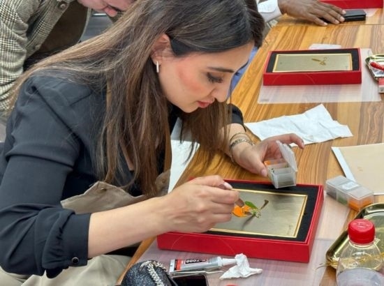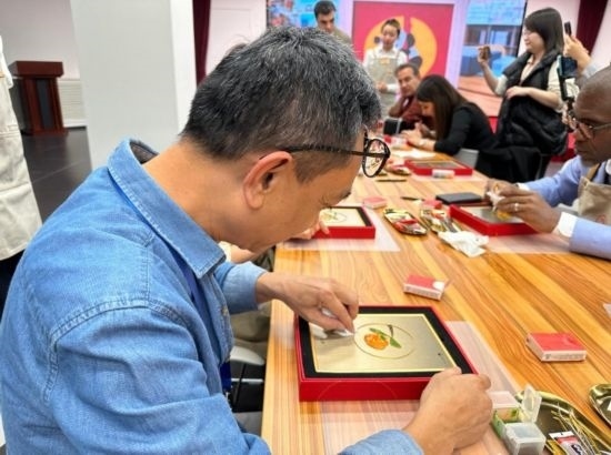 嘉賓在中國工藝集團(tuán)體驗景泰藍(lán)制作過程 (新華社記者王艷剛攝)