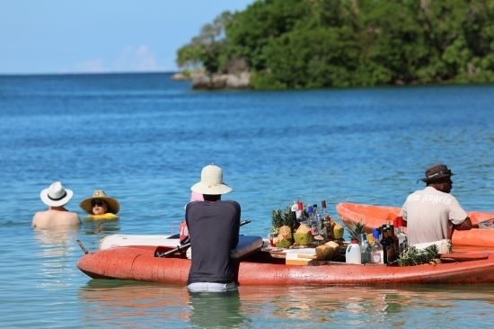 商販們推著載滿貨物的小船在海水里等待生意。唐薇 攝