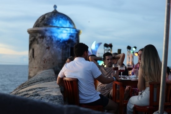 人們?cè)诳ㄋ占{古城墻上的酒吧聚會(huì),欣賞加勒比海落日。唐薇 攝